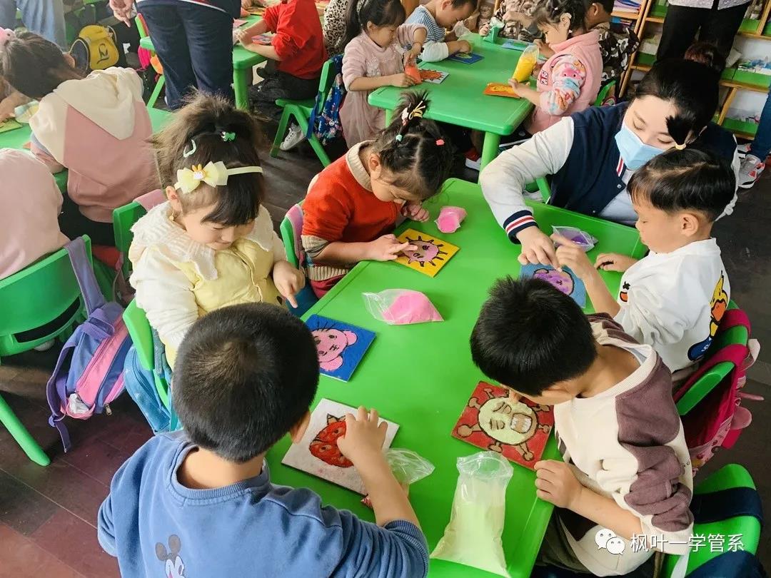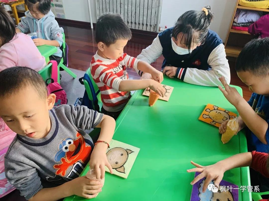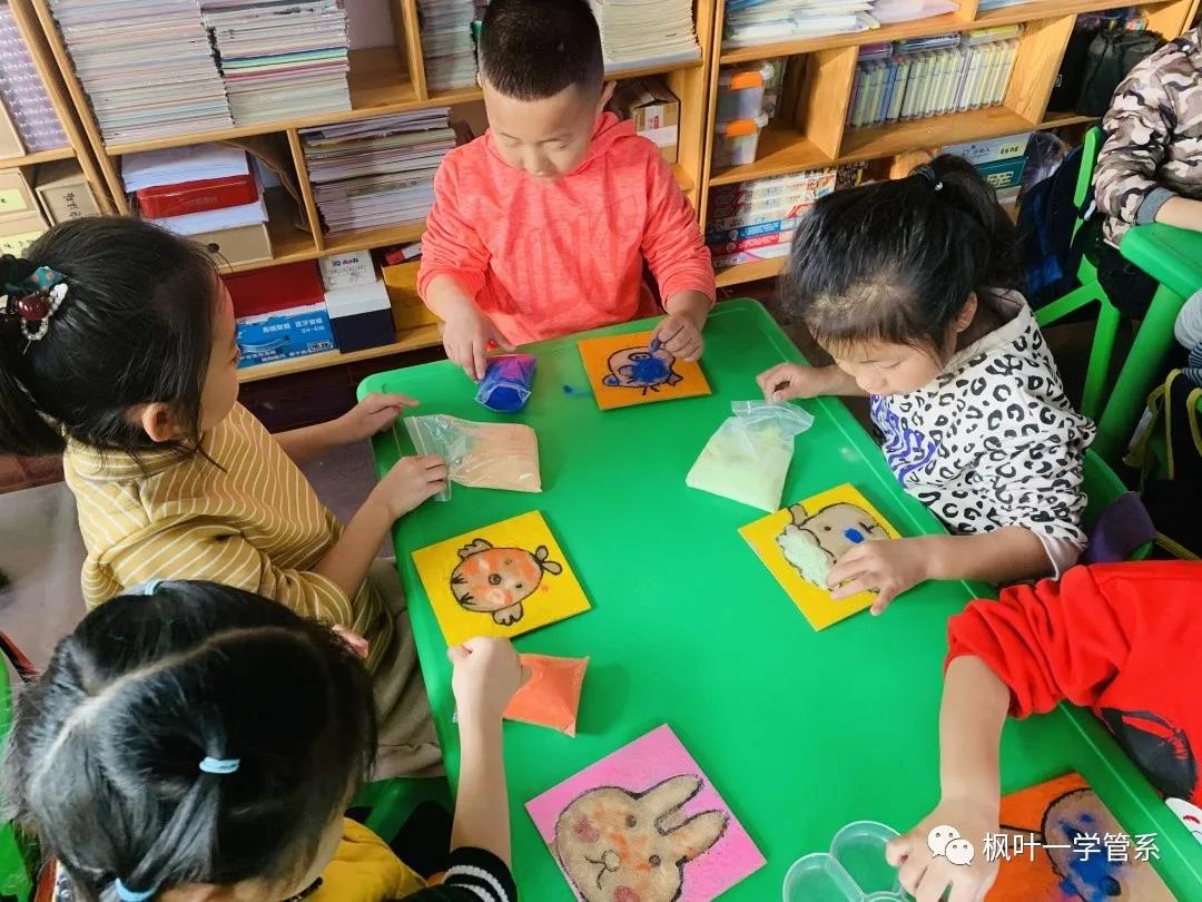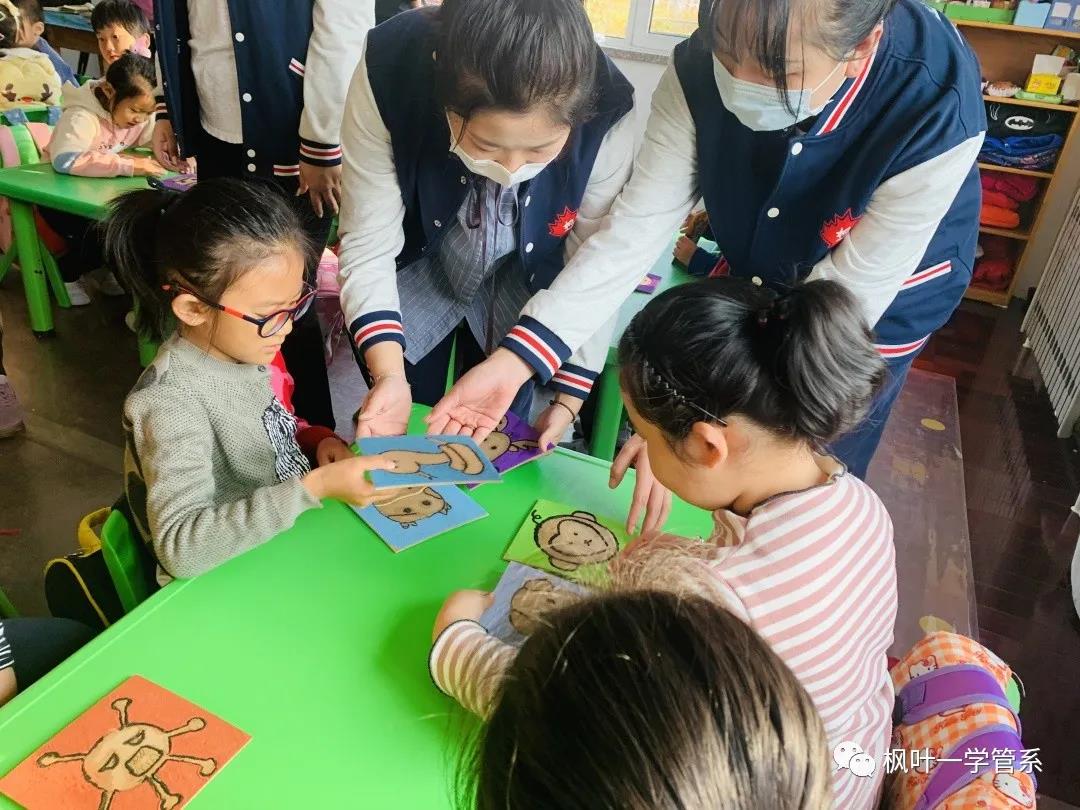几位小老师开始分发沙画教具并耐心的为小朋友们讲解示范,小朋友开始认真的动手制作沙画,小老师们到小朋友们身边耐心指导并及时到有困难的小朋友身边帮助他们。
