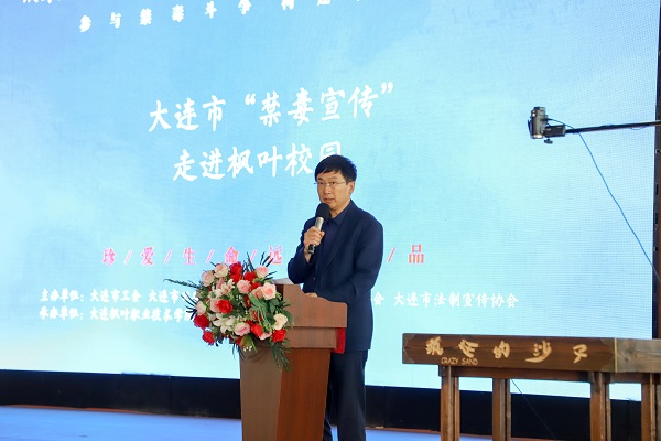 本次活动由大连市工会、大连市公安局、大连市文明办、大连市警察协会、大连市法制宣传协会等部门主办,由大连枫叶职业技术学院承办。大连市第十二届“全民普法周”组委会负责人、市法制协会副会长兼秘书长黄宝增、大连市公安局治安支队处长张守琪、大连市公安局禁毒支队教导员董军、大连枫叶职业技术学院院长杨捷出席活动。大会由学院团委学生处/保卫处处长高成林主持。