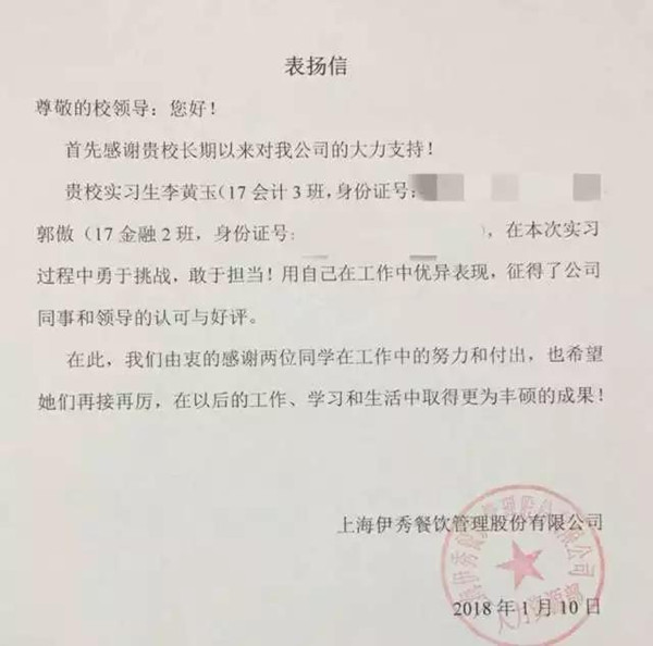 17会计三班李黄玉:很难去接受服务行业,毕竟以前想要的不是这种以后,毕竟从未抱有奢侈的一次的幻想从而获得领导和公司的认可,收到一封来之不易的——表扬信。兼职虽不是第一次,但途中艰辛波折亦充满人生四味,表面的风光必定拥有背后的遭罪,懂得金钱的来之不易也体会到了层次阶级的眼光看待,社会没有绝对的善恶,只有当你弱的时候坏人最多。有时只顾自己的花销,扪心自问却从未想过父母肩上的沉重。实习的打工经历,心中充满种种的五味杂陈。前方的道路必定荆棘,但也要感谢经历。一步一步的脚踏实地,朝着自己笔尖的方向,功不唐捐。很感谢领导和同事们的认可,从而也相信了快乐多于苦涩。愿自己能吃苦,爱赏花,亦能珍惜当下;生命无常,望人生别来无恙。