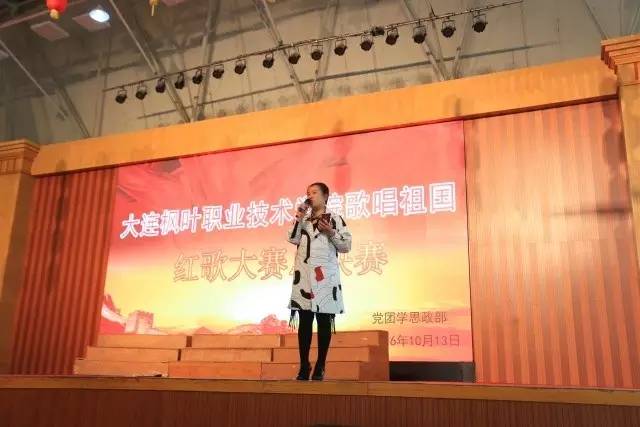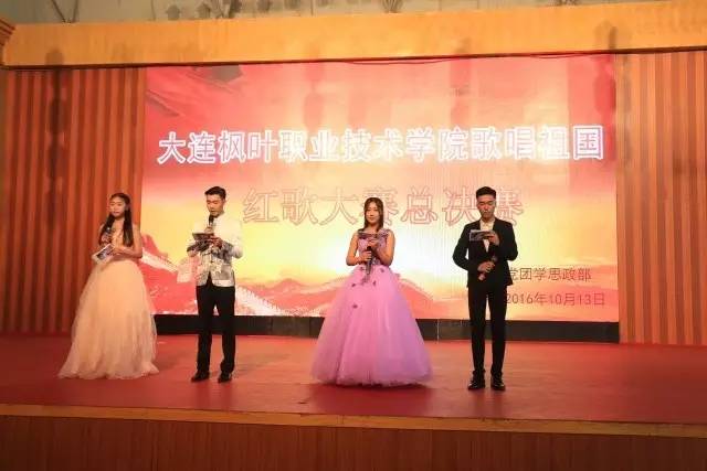 清风拂柳、温阳普照,激情澎湃、盛世欢腾。在这播种希望、描绘未来的季节里,我们又迎来了繁花似锦的红色十月——祖国成立67周年的伟大日子。在这令人难忘的时刻,我们敞开心扉,释放激情,唱响红色经典!我们纵情放歌,歌唱祖国,抒发时代豪情!大连枫叶职业技术学院歌唱祖国红歌大赛总决赛于2016年10月13日下午14:20在综合馆拉开帷幕。到场的各位评委嘉宾有:学生处处长助理吕运福,通关系学生管理主任徐凤龙,团委书记成名,网络中心主任薛飞,招生工作处梁陆宇,思政部教师潘丽萍、于杨,教务处薛杰,培训中心王琳。