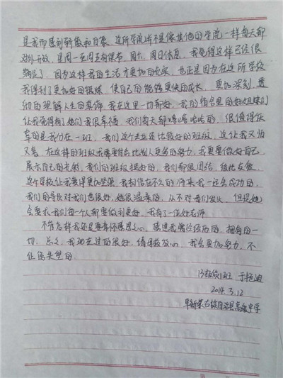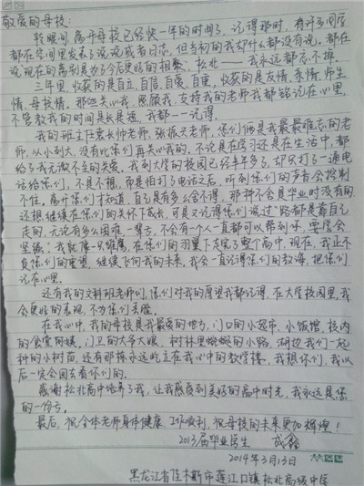 步履匆匆,大学生活已经过去一个学期了,同学们经历了很多,也成长了很多,有收获,更有感悟,从过去的学习中总结经验,坚定自己的目标,才能把握未来的方向,更好更充实地度过三年大学生活。在信中,同学们用回忆抒写了自己的高中时代,回想老师对自己的点滴教育,写下了心中对高中母校的思念与感激,同时也向母校介绍了在大连枫叶的发展和取得的成绩,汇报了自己在大学中的学习和生活情况,参加社会实践和校内活动的收获感悟。