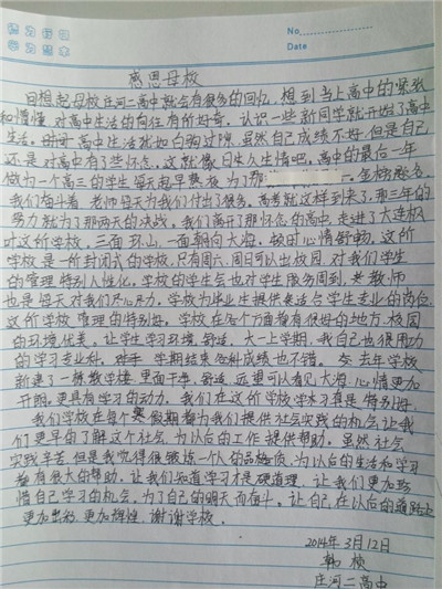 在五四青年节来临之际,我院团委举办了感恩母校,真情回馈,“致高中母校的一封信”活动,倡导同学们以情为笔,以恩为纸,用文字传达不变的真情。