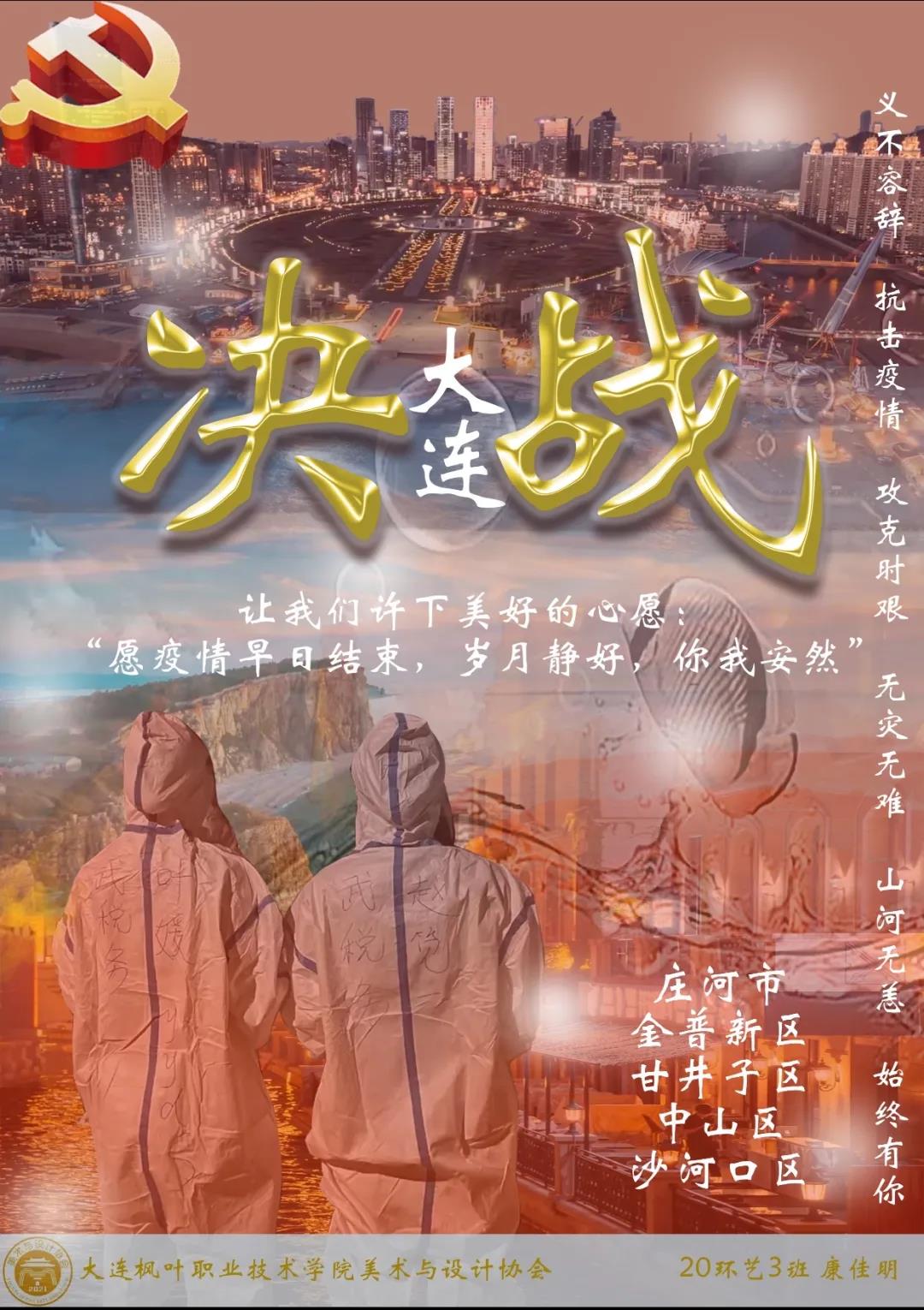 作品简介:整体以决战为主,颜色暗亮暗为基调,字体较大,突出主体,视觉中心放在了决战大连上,左上有我们的党徽,之后从上到下是我们的大连星海广场,老虎滩,东港,都是大连很著名的景区,中心是给大家最美好的祝愿:愿疫情早日结束,岁月静好,你我安然,左下是我们大连的重点地区,还有整体的光点突出亮度,中间还有海里小鱼的画面,也是对大海的向往,还有我们的防疫英雄,你们辛苦了,愿所有一线人员都早日平安回家!!!