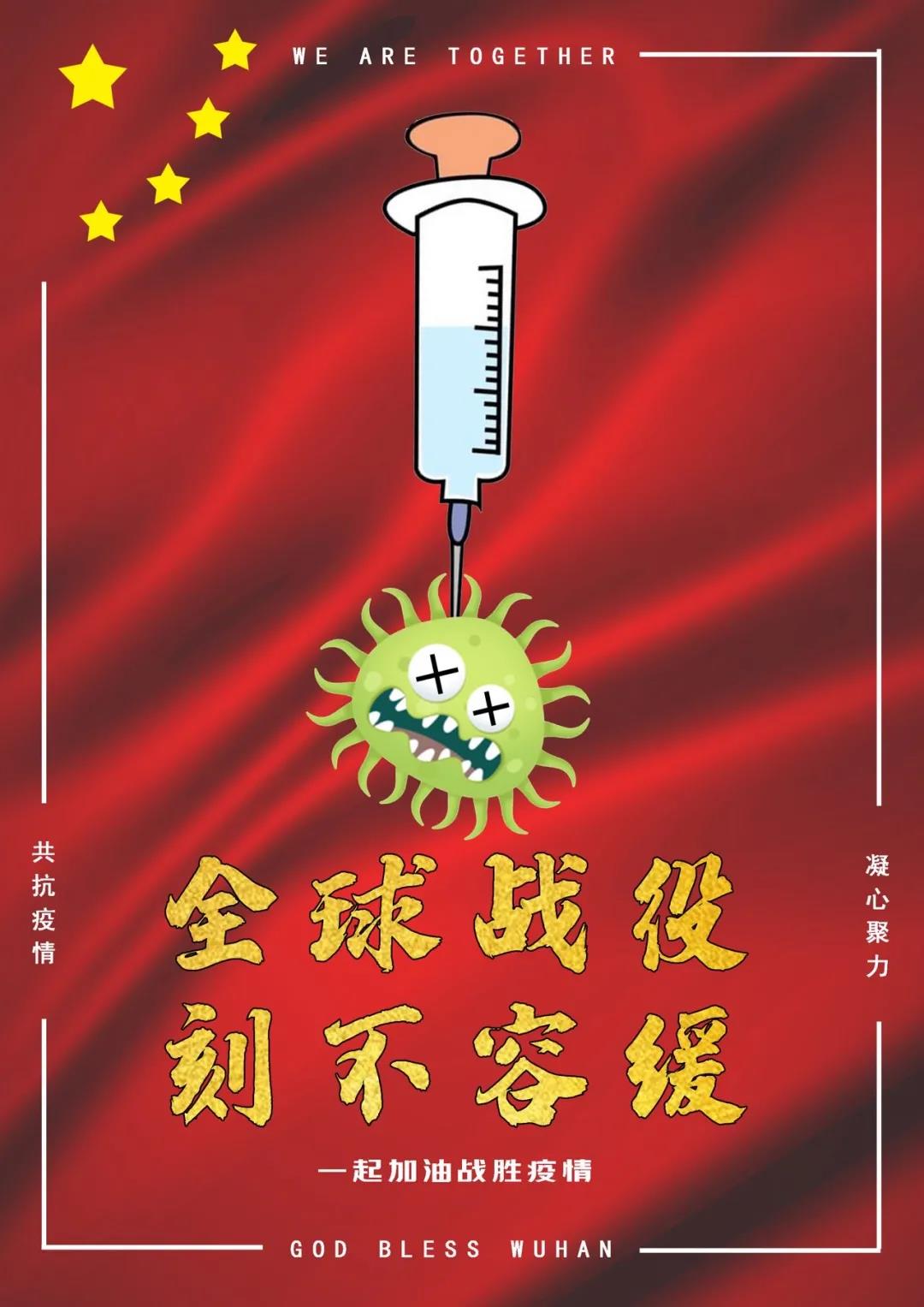 作品简介:全球战疫 刻不容缓,五颗星星和背景代表五行红旗,象征着伟大的祖国一定能战胜疫情,一起加油战胜疫情!