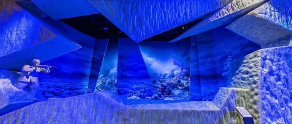 在抗美援朝战争历程全景沙盘中,实景沙盘+LED光点演示全面展示抗美援朝战争进程,作战双方的进攻路线、战斗态势一目了然;在冰雪长津湖场景中,运用时空并序的方法设计背景油画和近景,以裂开的冰块为外形,通过声、光、电展示志愿军战士在冰雪中鏖战的悲壮场面;在家喻户晓的奇袭白虎团场景中,选取了幻影成像+LED的手段来展示两个不同的空间,在形式上令人耳目一新。