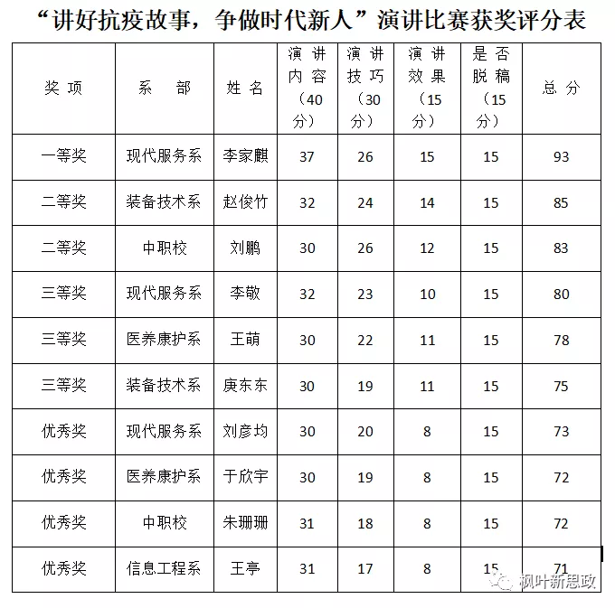 比赛分别从演讲内容、演讲技巧、演讲效果、演讲时长、是否脱稿进行评分,整个评分过程公平、公正、公开。现代服务系李家麒拔得头筹,获一等奖;装备技术系赵俊竹、中职校刘鹏获二等奖;现代服务系李敬、医养康护系王萌、装备技术系庚东东获三等奖;现代服务系刘彦均、医养康护系于欣宇、中职校朱珊珊、信息工程系王亭获优秀奖。