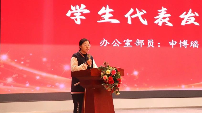 校学生会办公室申博瑶同学作为学生干部代表发言。她分享了自己的感悟,自加入学生会以来,收获颇丰,在这个充满挑战与机遇的平台上不断学习与成长,更得到了老师们的悉心指导与帮助。身为学生干部,应具备高度的责任感,时刻将同学们的需求铭记于心,积极主动地为大家解决问题、消除困扰。在未来的日子里,她表示自己也将继续努力,以更饱满的热情和更严谨的态度,与全体学生干部一同为同学们服务,为校园的和谐美好贡献力量。